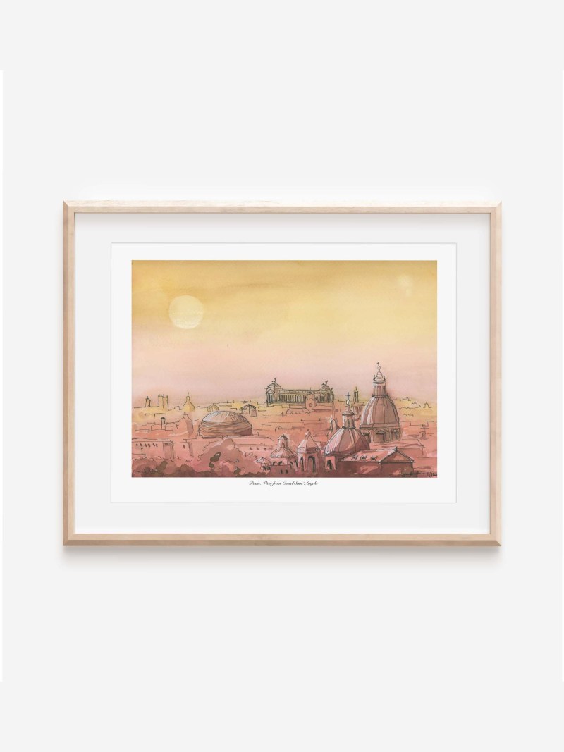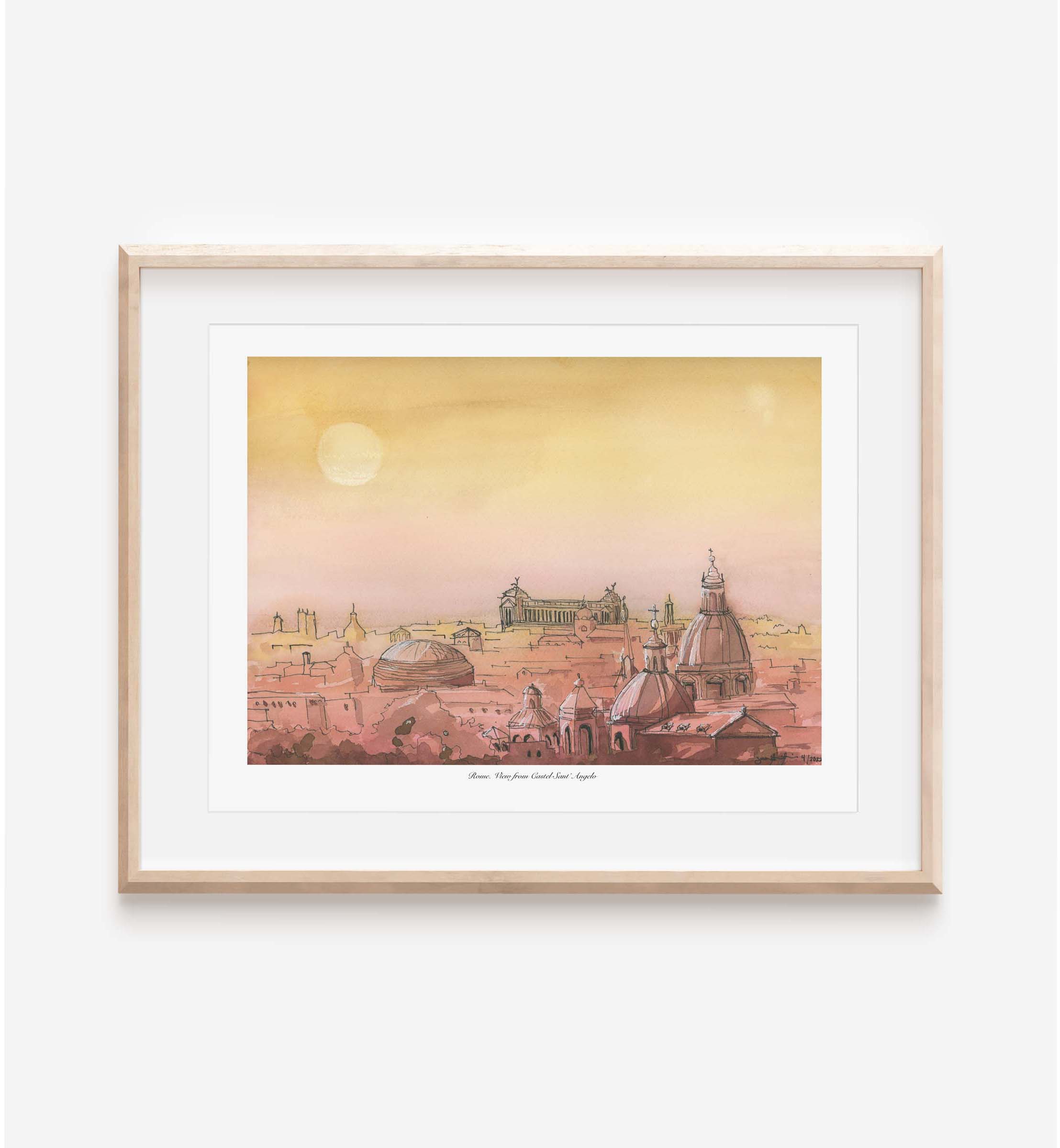 Rome. View from castel sant’angelo You can almost taste the espresso and gelato. 11×14. watercolor and ink. 2022 Related